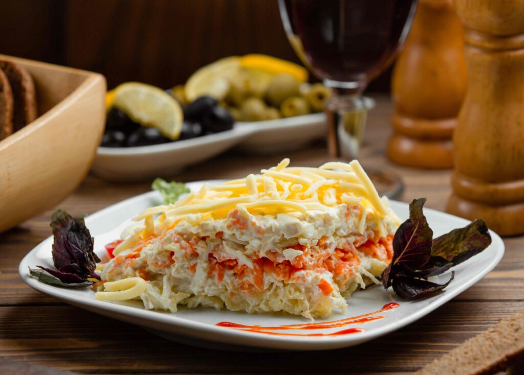 Causa Rellena is made from yellow mashed potatoes mixed with lime juice, a bit of oil, and chili peppers. The mashed potatoes are then layered with fillings such as shredded chicken, tuna, or seafood, along with avocado and mayonnaise. Some versions also include boiled eggs or olives for extra flavor and decoration.